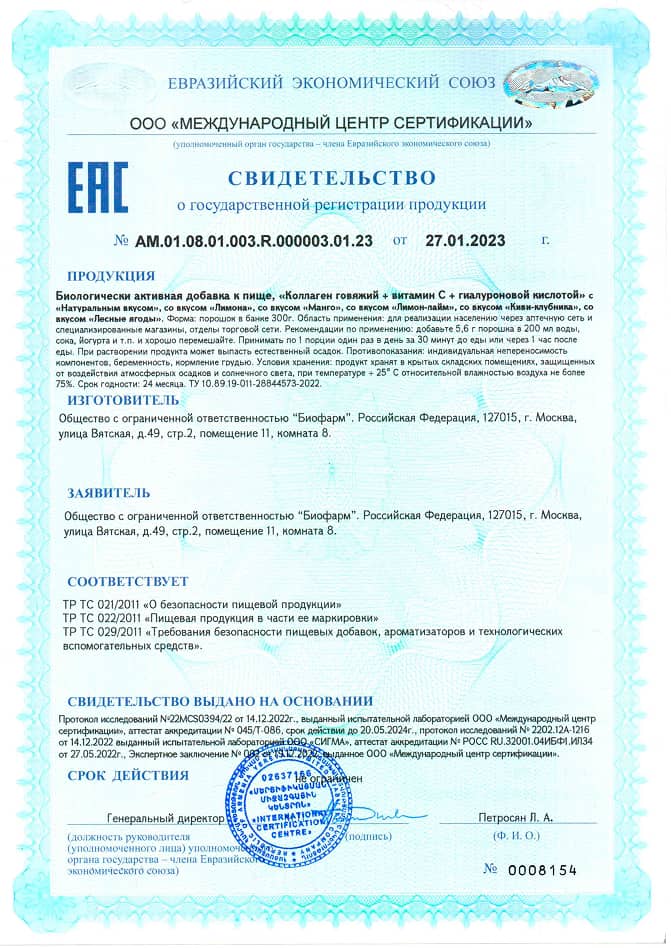 Комплекс на основе гидролизованного говяжьего коллагена I и III типов с витамином C и гиалуроновой кислотой для дополнительного поступления коллагена с рационом и поддержки нормального состояния кожи, волос, ногтей и суставов.